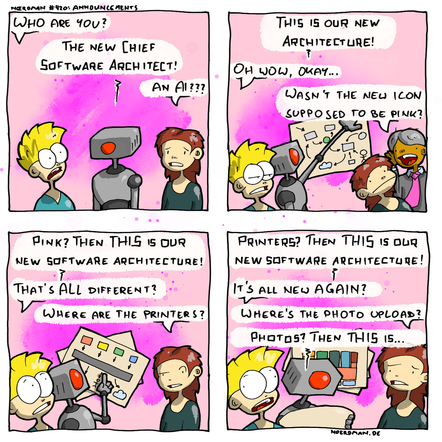 A web comic from the North, for technology freaks and geeks - and for those who desperately want to learn how to understand them. Since 2018, Noerdman, the Nordic geek, has been presenting a new comic each Monday. Teaching Technical Computer Science at the University of Bremen, we here illustrate some of the contents with dry Nordic humor and a good dash of self-irony. All those who love (or hate) computers: You are at the right place!